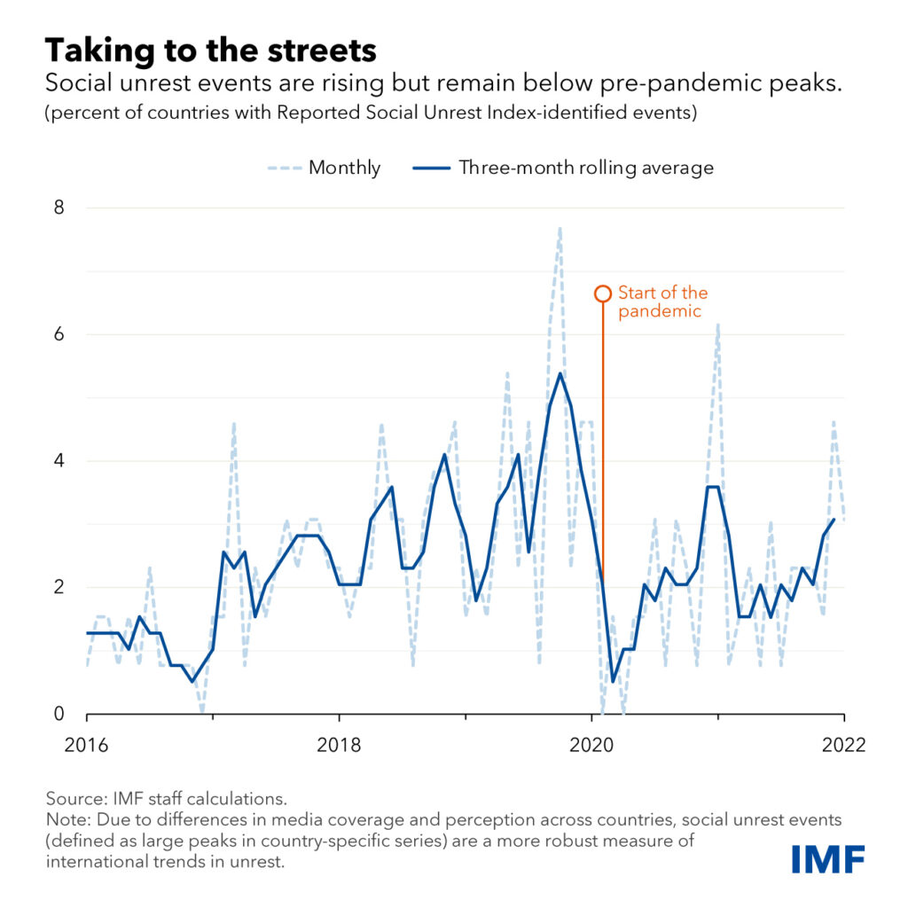El FMI ha publicado en su blog semanal un cuadro donde vaticina un incremento en la violencia política similar al que marco los días de 2019. El cuadro retrata unos duros días por venir cuando se comiencen a sentir los efectos de las tres convidadas de piedra sobre las cuales nadie hablará en la Cumbre de las Américas.
