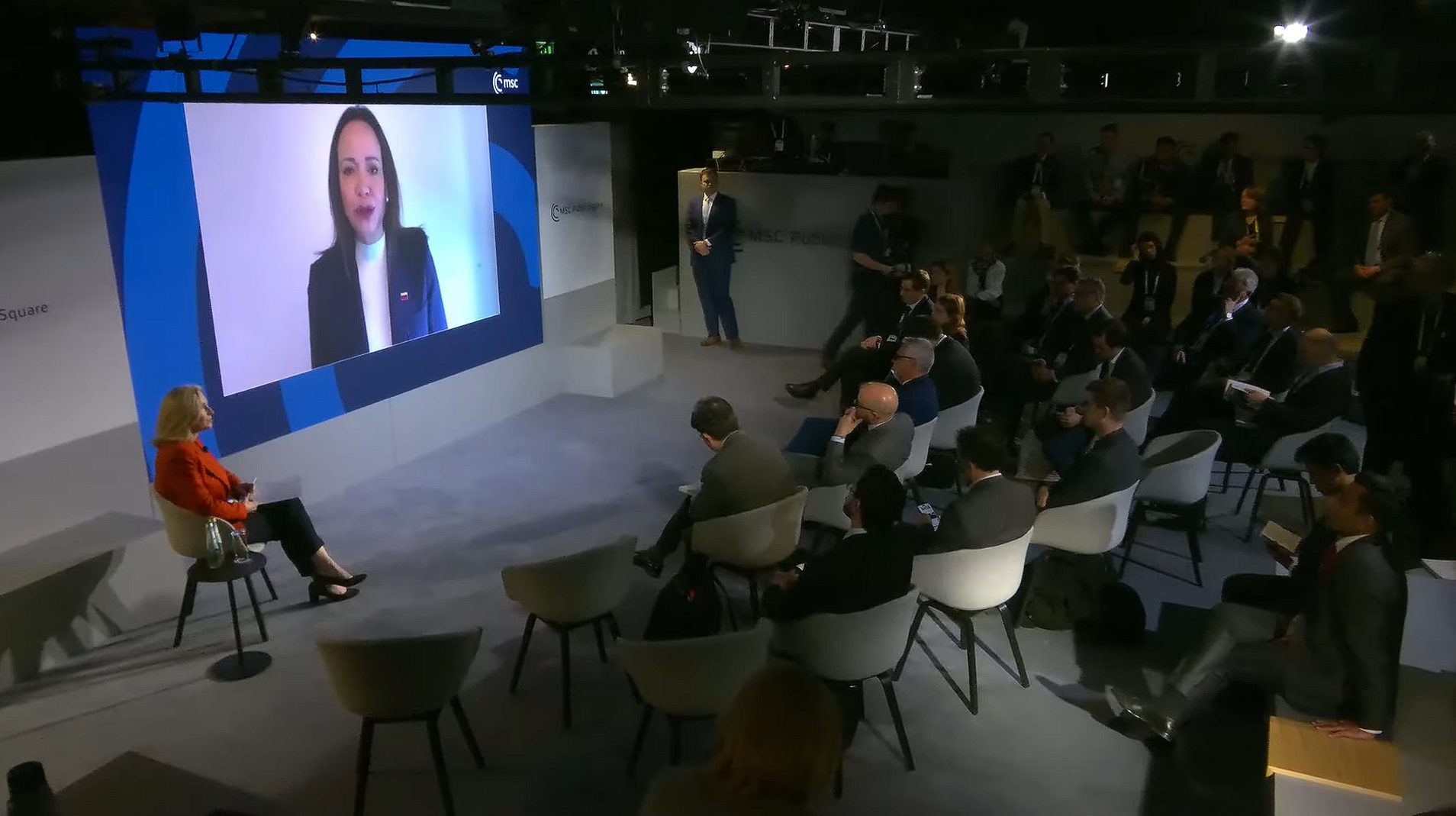 María Corina tiene comunicación permanente con el gobierno de EE.UU., Congreso (bipartidista) y otros sectores, ya que Venezuela es prioridad de seguridad nacional por temas como migración, energía, seguridad y comercio. Para Europa, pidió pasar de declaraciones a acciones: bloquear flujos de dinero criminal, medidas contra grupos represores élite (unos pocos miles altamente armados), remover la penetración extrahemisférica (Cuba, Rusia, Irán) y recuperar activos robados (miles de millones). Sobre China, reconoció deudas reducidas a 16 mil millones de dólares, pero exige transparencia y cumplimiento en futuras relaciones, desmantelando infiltraciones en instituciones y espionaje. Apoyó operaciones antinarcóticos en el Caribe y Pacífico, instando a coaliciones con países europeos, caribeños y sudamericanos.