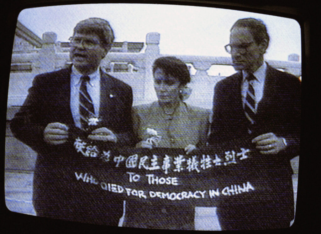 En esta foto de archivo del 4 de septiembre de 1991, los legisladores estadounidenses, de izquierda a derecha, el representante Ben Jones, demócrata por Ga, la representante Nancy Pelosi, demócrata por California, y el representante John Miller, republicano por Washington, sostienen una pancarta con el palabras «A los que murieron por la democracia en China» en la Plaza de Tiananmen, Beijing, China el miércoles 4 de septiembre de 1991 para honrar a las víctimas de la represión de 1989 contra los manifestantes a favor de la democracia. (Foto AP)