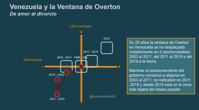 Las condiciones objetivas de la elección presidencial en 2024 muestran que la mayoría de la opinión pública venezolana se concentra en el eje positivo de la democracia y el libre mercado, según la Ventana de Overton elaborada por David Moran. La ventana “se ha desplazado notablemente en tres oportunidades: 2003 al 2011 –cuando se dieron las victorias de Chávez–, del 2011 al 2019 –triunfo de Henrique Capriles Radonski en 2013 y la elección parlamentaria de 2015– y del 2019 a la fecha”.