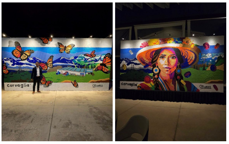El artista venezolano Oscar Olivares, conocido por su innovador trabajo con materiales reciclados, develó dos nuevos e impresionantes murales elaborados con más de 20 mil tapas de plástico cada uno, en una ceremonia especial con motivo del 20.º aniversario de la empresa suiza Corvaglia, líder en la fabricación de tapas, en Toluca, México.