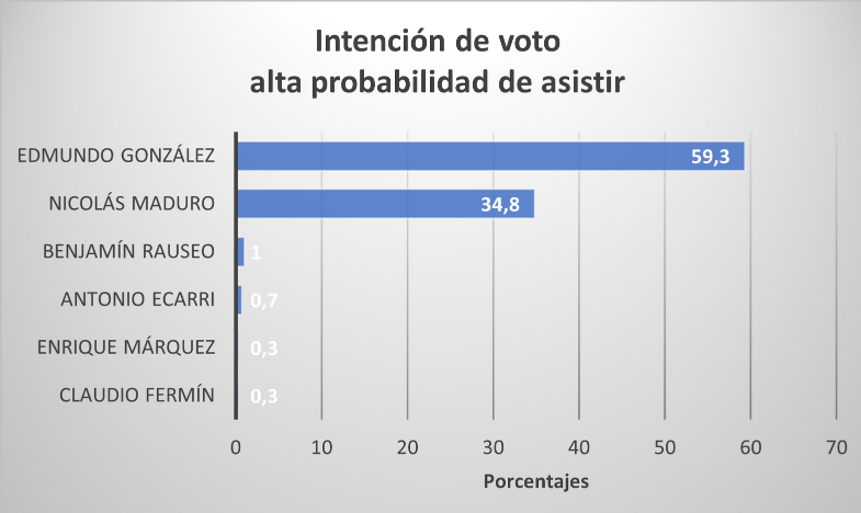 Al considerar el segmento con alta posibilidad de ir a votar Edmundo González superaría a Nicolás Maduro por dos millones de votos. Si se añaden los que tienen una probabilidad media alta de votar, la brecha crecería hasta 2,4 millones y si se suman los que tienen una probabilidad media la brecha se dispararía hasta 4,4 millones de votos.