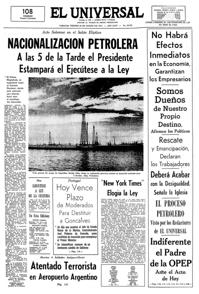 El momento cumbre de nuestra participación en el debate sobre la nacionalización fue la reunión en Miraflores, a la cual fuimos invitados por el presidente Carlos Andrés Pérez en enero de 1975, una invitación lograda por el ingeniero Carlos Rengifo. A esa reunión acudimos unos 400 empleados petroleros de todas las áreas del país y, en dos horas y diez y siete minutos, le hicimos al presidente y su gabinete en pleno once presentaciones sobre los aspectos financieros, estratégicos, organizacionales, operacionales, comerciales y de recursos humanos relacionados con la nacionalización en ciernes. Al final de estas presentaciones CAP dijo que se había sentido impresionado de nuestra precisión y disciplina y por oír de nosotros sobre muchos aspectos del proceso que no conocía hasta ese momento. Se rio abiertamente cuando yo, abriendo el ciclo de presentaciones, dije que las directivas de las empresas nacionalizadas nunca deberían incluir políticos de carrera.