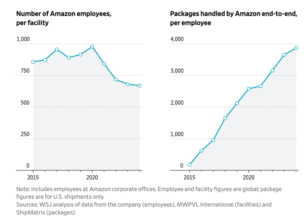 El Wall Street Journal informó que Amazon, el segundo empleador privado más grande de Estados Unidos, se acerca rápidamente a un nuevo hito en la automatización de almacenes: «Pronto habrá tantos robots como humanos». Esto equivale a más de un millón de robots.