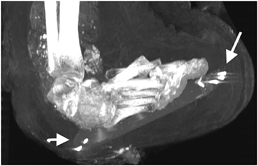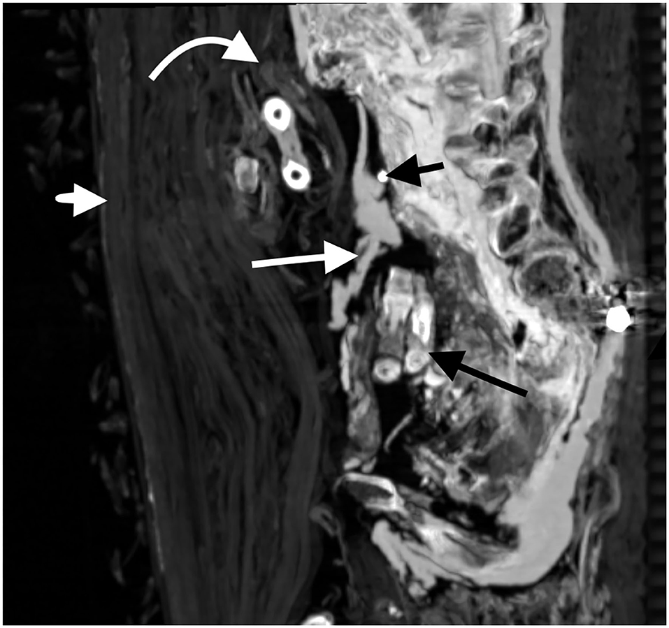 La evidencia de ladrones de tumbas también estaba presente. El brazo izquierdo fue desarticulado y luego vuelto a envolver extendido junto al cuerpo de la momia. El brazo derecho de la momia, sin embargo, está doblado por el codo con el antebrazo superpuesto al abdomen, lo que indica que probablemente ambos brazos alguna vez estuvieron cruzados de la misma manera. Dos dedos de la mano izquierda también fueron desmembrados, probablemente por ladrones de tumbas, y fueron localizados dentro de un gran defecto de la pared de la cavidad abdominal. Más notable aún, el cuello de la momia había sido cortado, la cabeza decapitada y se volvió a unir con una banda de lino tratada con resina con un amuleto colocado debajo.