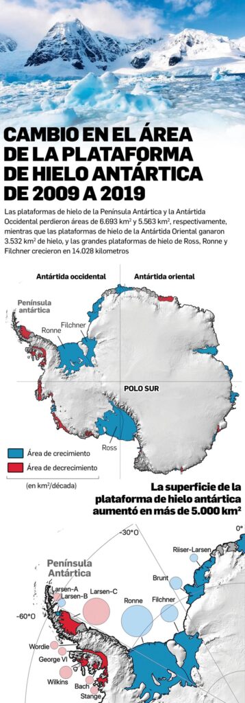 No obstante, un estudio publicado por la Unión Europea de Geociencias (EGU, por sus siglas en inglés) y firmado por tres investigadoras de las universidades de Leeds (Reino Unido) y Minnesota (EE.UU.) afirma que la plataforma de hielo antártica ha crecido en 5.304 kilómetros cuadrados en el período entre 2009 y 2019.