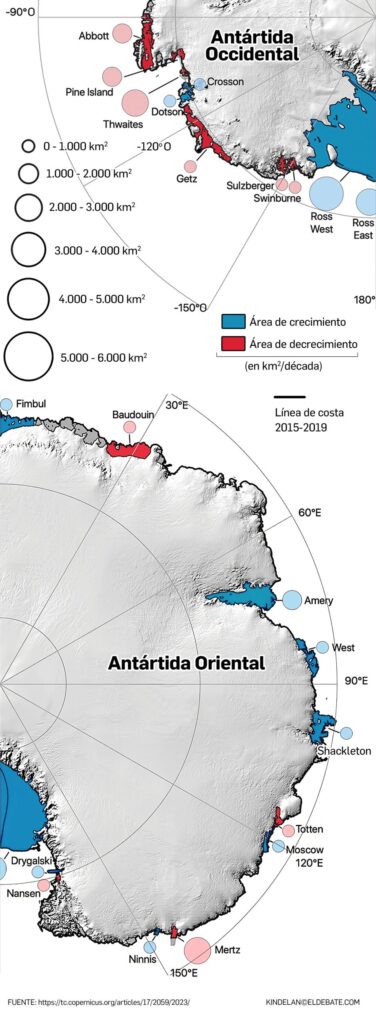 En general, el área de la plataforma de hielo antártica ha crecido en 5.305 km² desde 2009, con 18 plataformas de hielo retirándose y 16 plataformas más grandes creciendo en área.