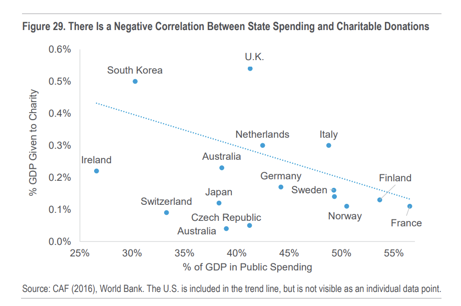Por ello, el gasto público tiende a desplazar al gasto y la inversión privados. Los economistas llaman a este fenómeno desplazamiento. El auge del Estado del bienestar, por ejemplo, ha desplazado a la caridad privada. Un informe de Citigroup afirma: «En los países con un gasto público más elevado, existe la sensación de que cualquier deuda con la sociedad se ha saldado a través de la factura fiscal de un individuo o una empresa. Donde hay menos gasto público, hay una mayor sensación de que se debe algo». Esta distinción marca la tendencia del gráfico 29″.