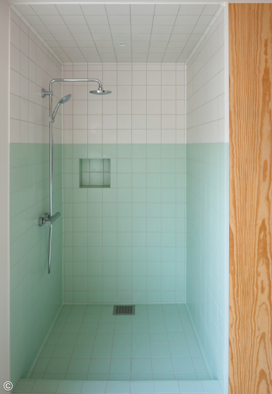 Del mismo modo, House L&W tiene principalmente interiores completamente blancos, pero incluye una ducha de inspiración retro cubierta con baldosas de cerámica color menta, una cortina de baño muy popular en los años 70 (que incluso aparece en películas icónicas como The Shining ).