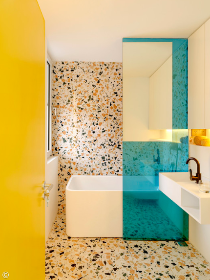 Aparte de las baldosas de cerámica, el terrazo fue enorme en las casas de los años 50 y 60 hasta que pasó de moda en la era disco. Sin embargo, no pasó mucho tiempo para que reviviera en el diseño de interiores contemporáneo , principalmente debido a su durabilidad, flexibilidad de diseño y fácil instalación. Mientras que los baños modernos como el de la Casa P integran superficies de terrazo de colores, otros como el de Cats ‘Pink House utilizan un papel pintado lúdico que imita el aspecto retro del material.