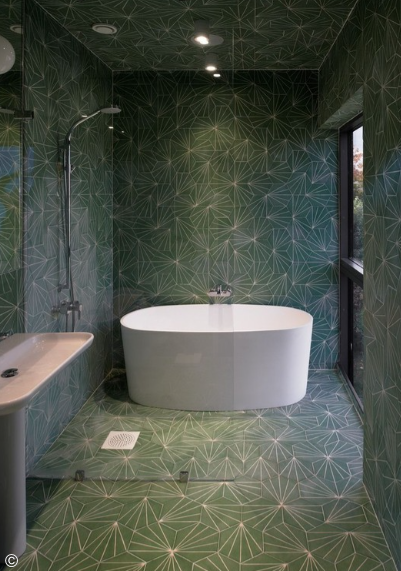 Hoy, estamos viendo un renacimiento de estos patrones vibrantes en baños modernos, integrando formas únicas y esquemas de colores retro. Tal es el caso de la suite de baño en Fagerstrom House, donde los arquitectos utilizaron baldosas verdes para el piso y las paredes para crear un patrón hexagonal envolvente. Del mismo modo, el baño reformado de la Casa HC incorpora un patrón de azulejos geométricos con diferentes tonalidades de amarillo vivo.