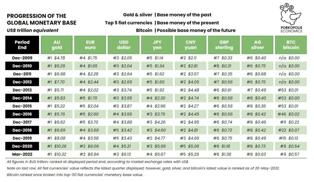 Matthew Mežinskis nos ha obsequiado con otra actualización de la base monetaria global. A fines del primer trimestre de 2022, bitcoin se ubica como el noveno dinero base más grande del mundo (incluidos el oro y la plata).