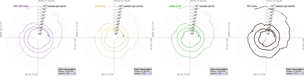 Por ejemplo los gráficos de Bitcoin se ven muy diferentes dependiendo si usas como medida el dólar americano, el Peso argentino, la Naira nigeriana o el Bolívar venezolano o puedes aún elegir el índice del SP 500 el oro o barriles de petróleo.