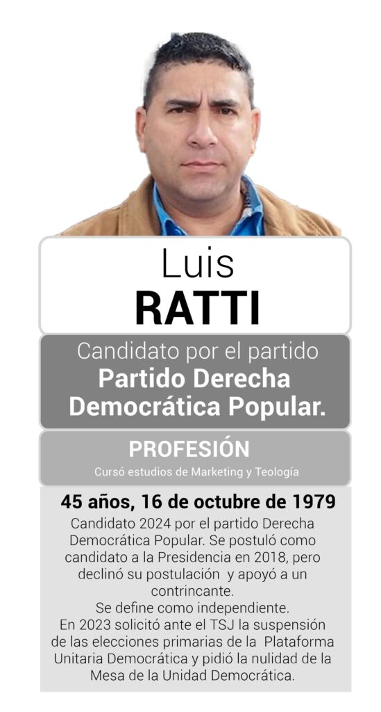De la mano del partido Derecha Democrática Popular, Ratti es otro de los que integran la lista de “opositores” que participarán de las elecciones presidenciales del 28 de julio. Sin embargo, esta no es la primera carrera por la Presidencia que emprende, ya que en 2018 –cuando Maduro se reeligió en unos comicios plagados de irregularidades y cuestionados por la comunidad internacional– Ratti también llegó a postularse, pero terminó por declinar y apoyar a un contrincante.