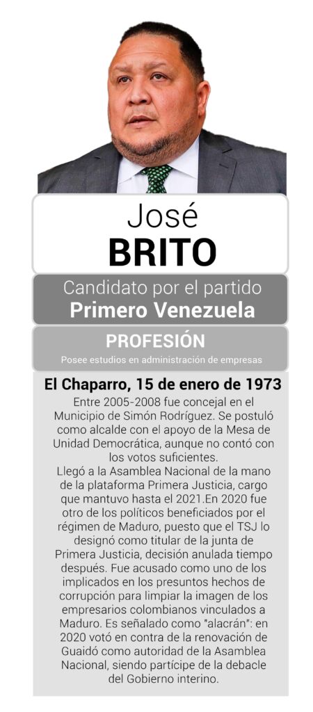 Es otro de los candidatos acusados de operar a favor de Maduro. Brito ocupó varios cargos públicos. Entre ellos, fue concejal en el Municipio de Simón Rodríguez en el período de 2005-2008. Luego, se postuló como alcalde con el apoyo de la Mesa de Unidad Democrática, aunque no contó con los votos suficientes.