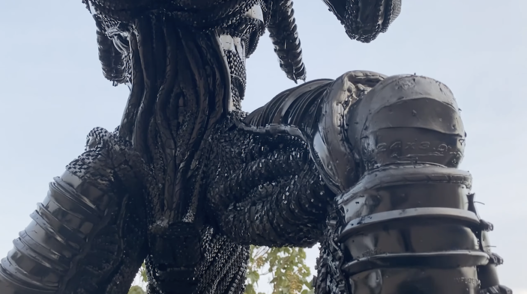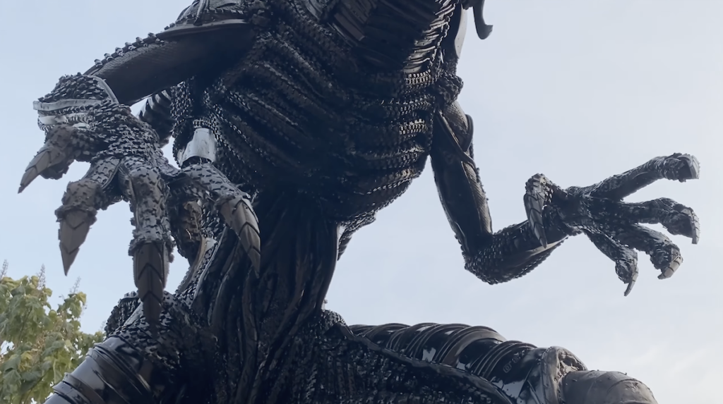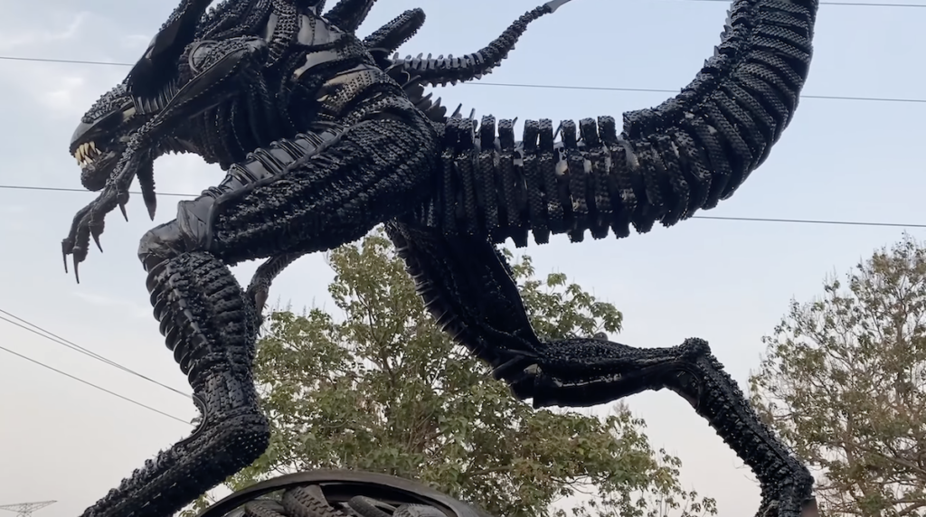 Durante 20 días, habrá esculpido meticulosamente cada elemento para darle un tamaño humano al Alien y luego ensamblará los cauchos s y cámaras de bicicleta recicladas para simular la textura de su piel y las escamas de su cuerpo.