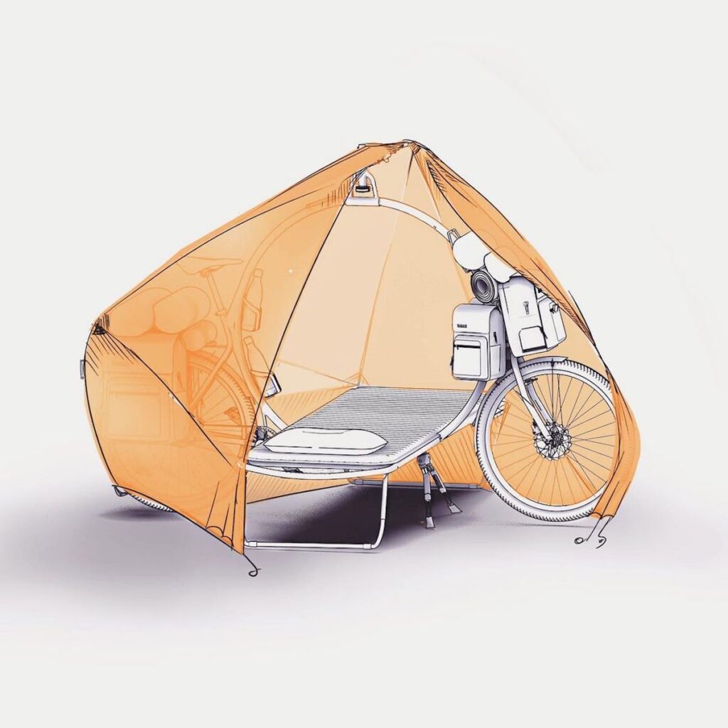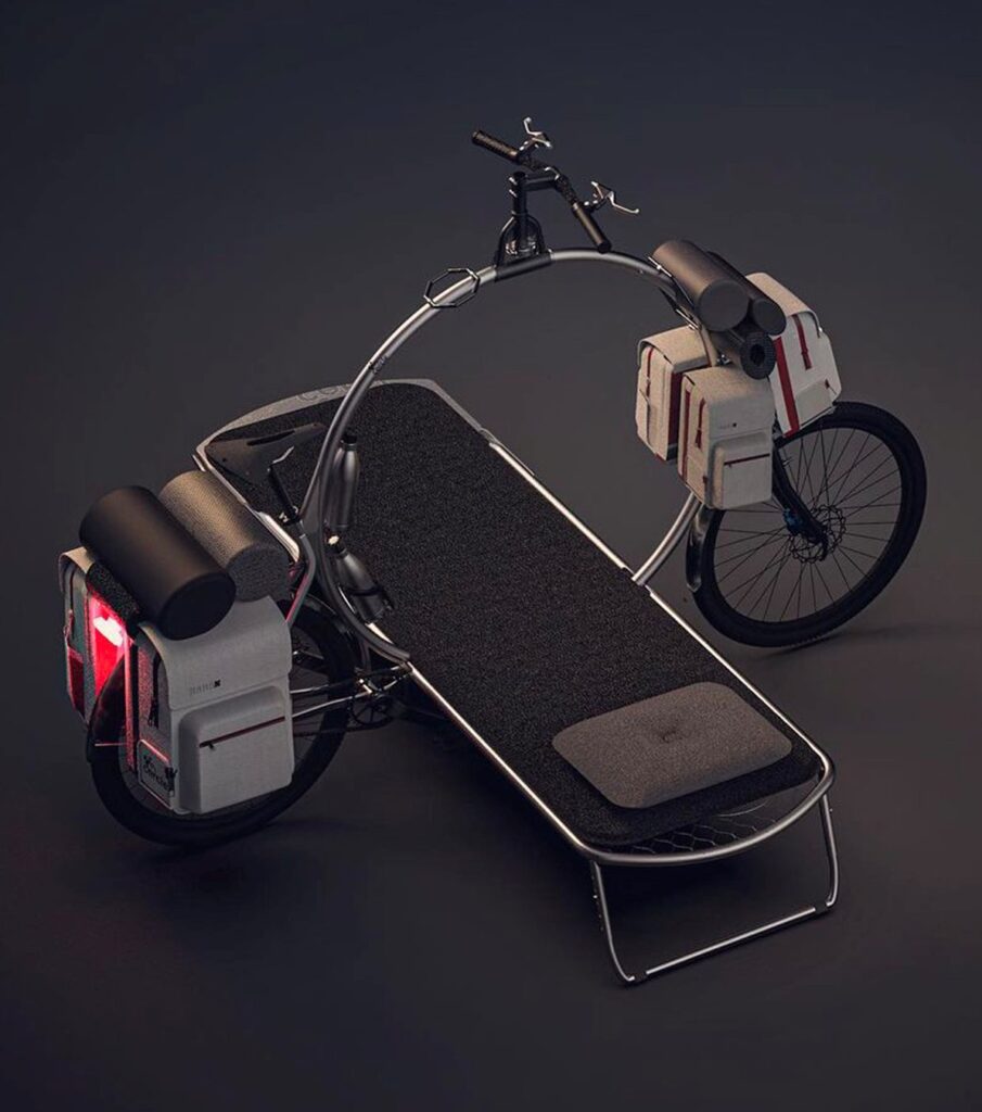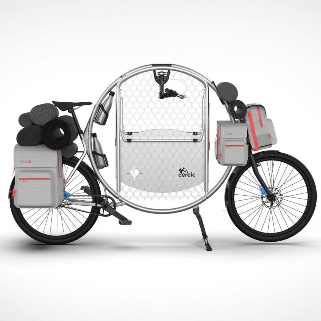 Todo esto sería posible gracias a su muy atípica estructura metálica en forma de círculo que le permite cumplir varias funciones, incluida la de cama o tienda, sin impedirle, por supuesto, pedalear.