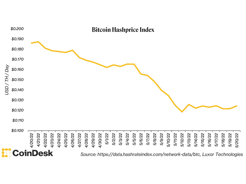 En medio de la caída de los precios de bitcoin, también existe cierta preocupación por los mineros de bitcoin y su rentabilidad. Hay una métrica desarrollada por Luxor Technologies llamada hashprice que representa el valor esperado de la minería. Hashprice se expresa como un dólar por terahash por día, siendo un terahash la potencia computacional proporcionada por el equipo de minería. Así es como le ha ido al hashprice en el último mes.