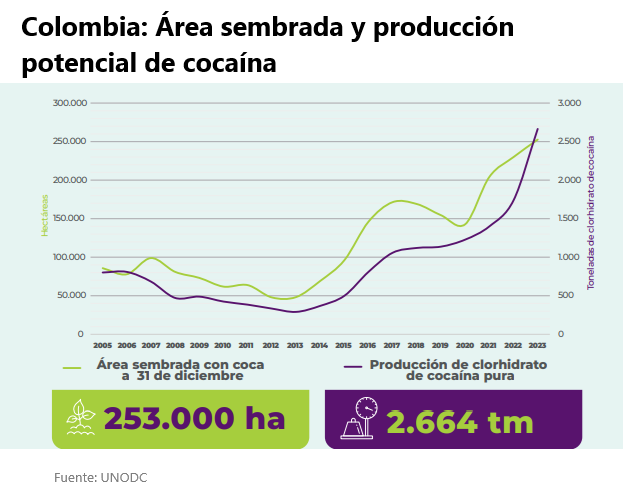 El cultivo de arbusto de coca en Colombia aumentó un 10 por ciento en 2023 a 253.000 hectáreas, mientras que la producción potencial de cocaína alcanzó las 2.664 toneladas métricas, según una nueva encuesta publicada por la Oficina de las Naciones Unidas contra la Droga y el Delito (UNODC).