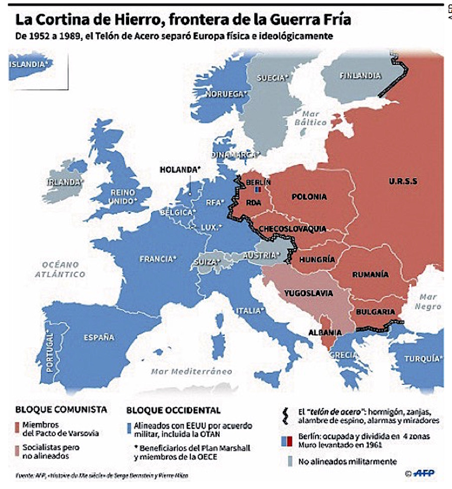 Las secciones ocupadas por Gran Bretaña, Francia y Estados Unidos se convierten en Alemania Occidental ―República Federal de Alemania (RFA)― y para escudarse militarmente crean la Organización del Atlántico del Norte (OTAN) y la región soviética, en Alemania Oriental ―República Democrática Alemana (RDA)―.