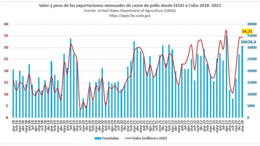 En perspectiva, los datos demuestran que enero fue el sexto mayor valor histórico desde 2002, cuyo récord se alcanzó en agosto de 2023. Ese mes, Cuba importó de EE UU 35.117,1 toneladas de pollo, por encima de anteriores picos como julio de 2019 (casi 34.000) y marzo de 2021 (32.700).