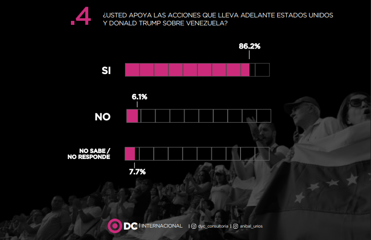 El informe introduce un componente geopolítico llamativo. El 86,2% de los venezolanos apoya las acciones de Estados Unidos y Donald Trump respecto a Venezuela, y casi la mitad (49,2%) considera que el expresidente estadounidense debería “intervenir militarmente” en el país.