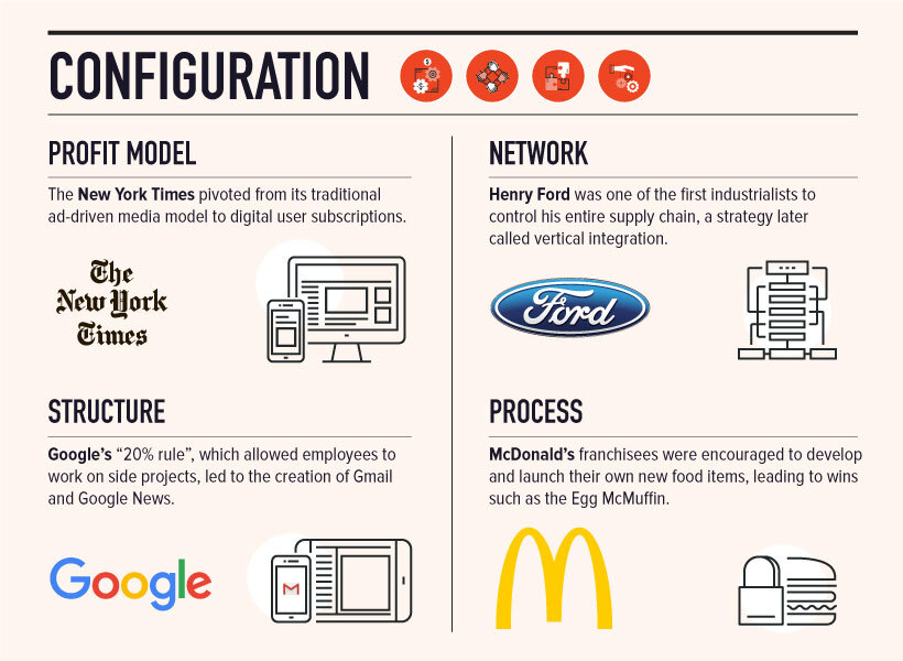 Aunque los tipos de innovación en esta categoría no están directamente orientados al cliente, como puede ver en los ejemplos a continuación, aún pueden tener un impacto importante en la experiencia del cliente. La forma en que se organiza su empresa y sus productos puede tener un efecto posterior crucial, que incluso permitirá innovaciones en otras categorías.