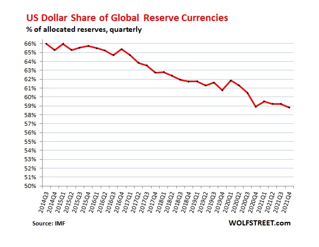 Tenga en cuenta, como señala Wolf Richter, que la participación mundial de las reservas de divisas denominadas en dólares estadounidenses cayó 40 puntos básicos desde el tercer trimestre hasta el 58,8% en el cuarto trimestre, estableciendo un nuevo mínimo en 26 años, superando el mínimo del cuarto trimestre. 2020, según datos del COFER del FMI publicados a fines de marzo.