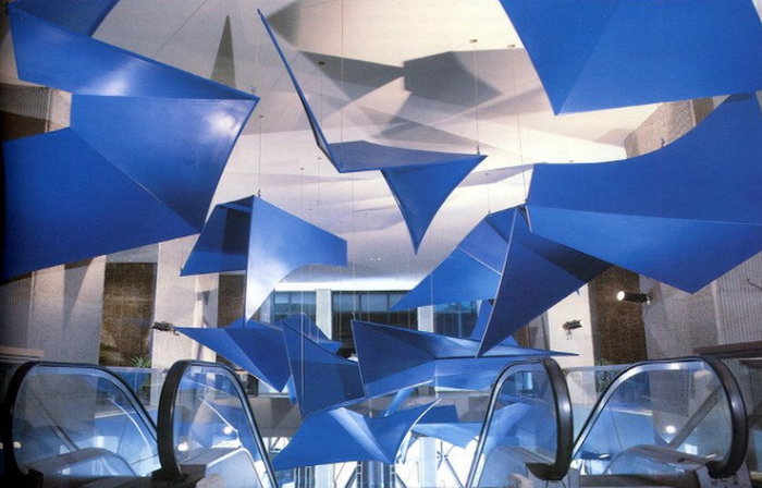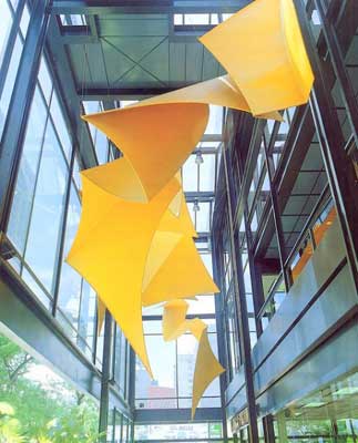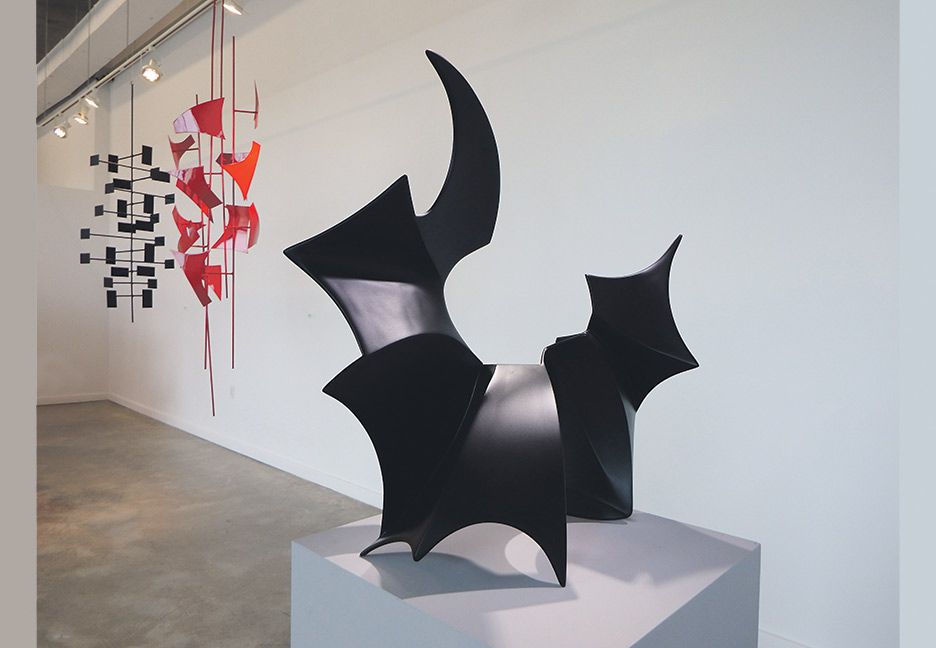Sus obras parecen alzar el vuelo en el espacio que abarcan. Podrían ser pájaros o murciélagos coloridos que intentan alcanzar el cielo, que juegan con la gravedad de la tierra, que se mantienen suspendidos en el tiempo.