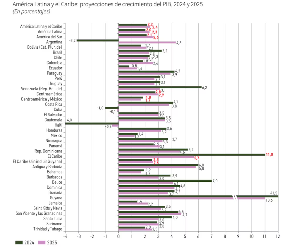 En 2024, las economías de Sudamérica crecerían un 2,1%, las de Centroamérica un 2,8% y las del Caribe un 11%; aunque sin incluir a Guyana, la expansión del PIB sería de apenas el 2,5%.