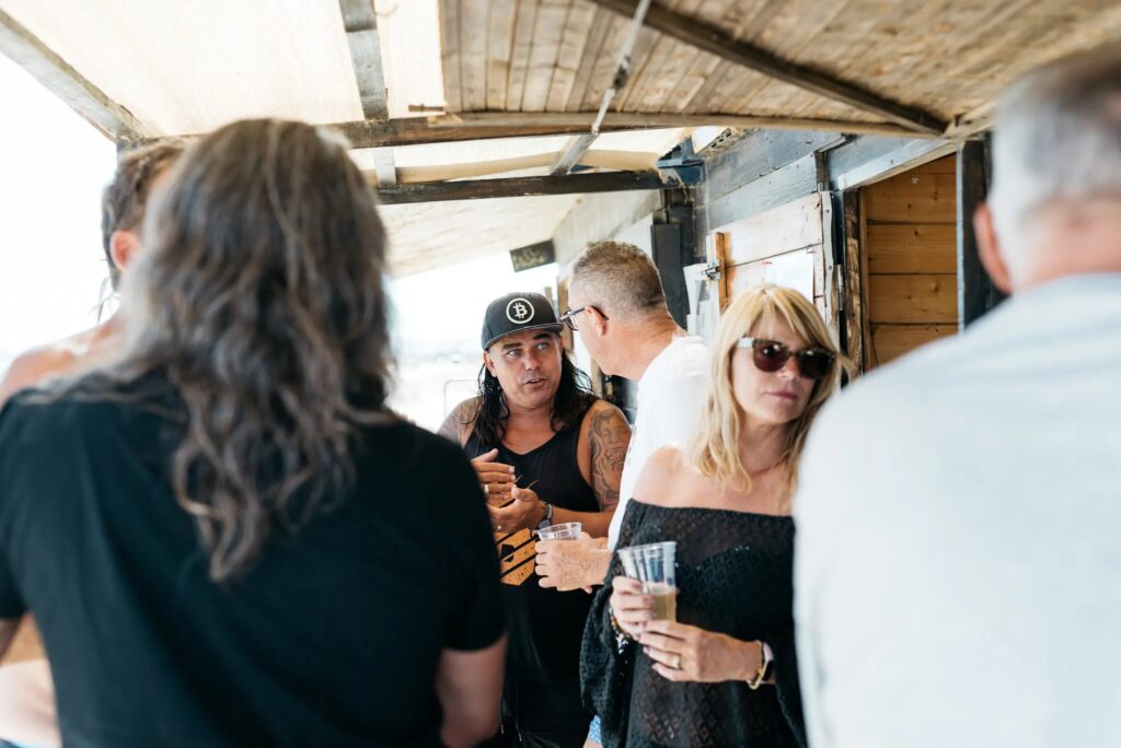 Para llegar ahí, debes conducir más allá de un puerto de barcos, hoteles junto al mar y edificios de departamentos, luego te estacionas cerca de un restaurante de mariscos poco ajetreado y caminas por un sendero de madera que atraviesa una duna de arena. Banderas amarillas con el símbolo de bitcóin se mueven por el viento. Se escuchan conversaciones sobre criptomonedas y un futuro descentralizado.