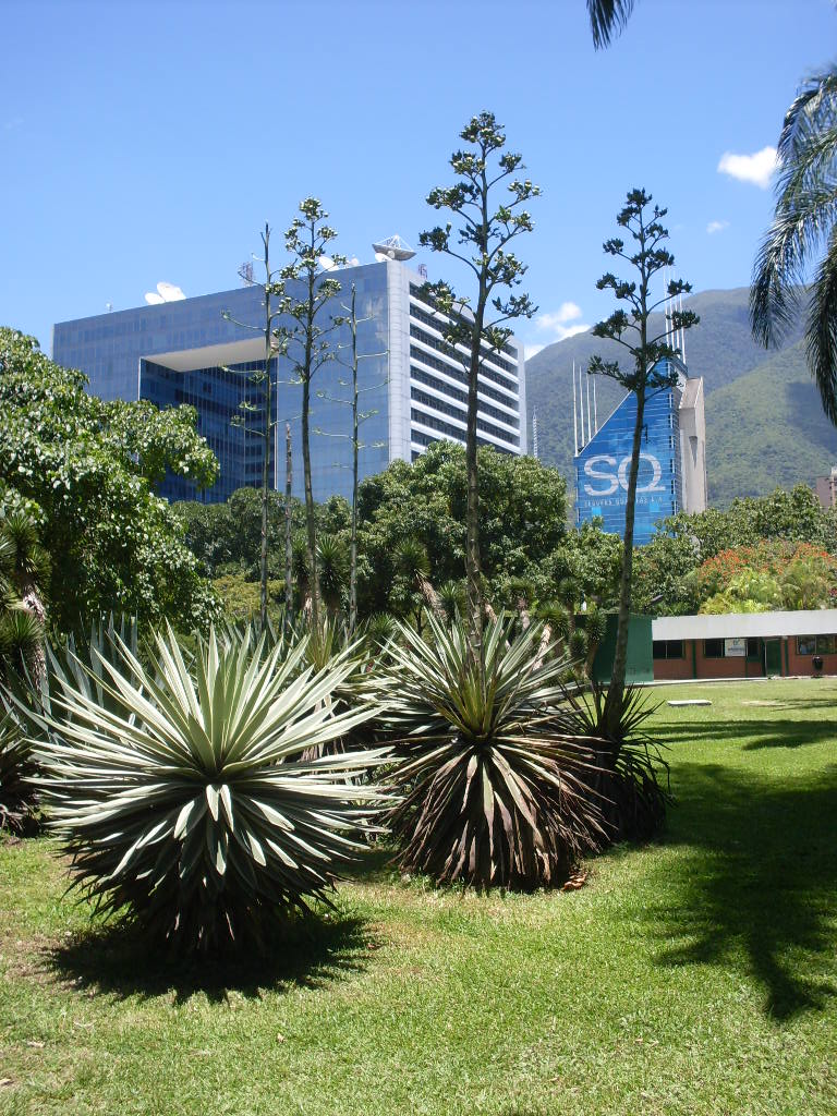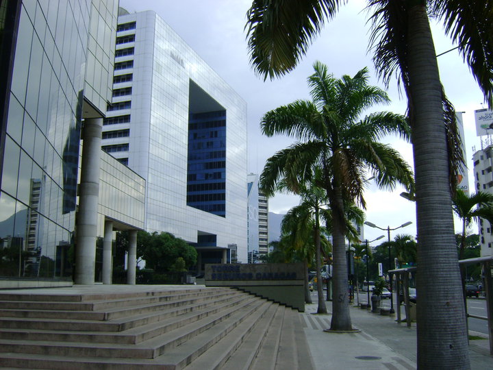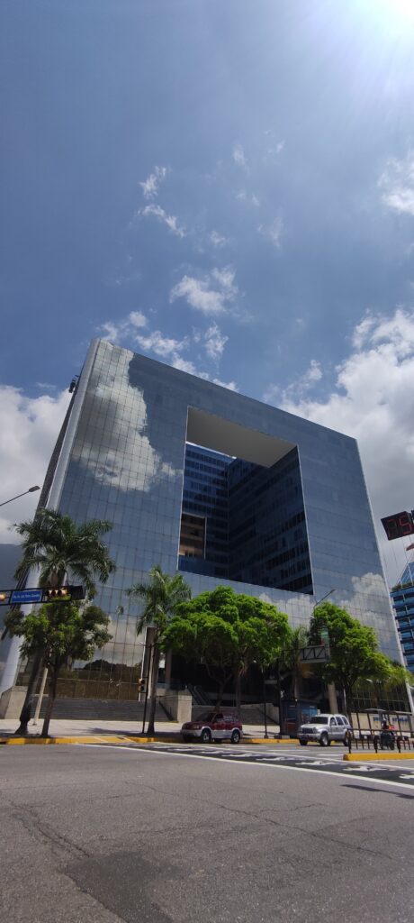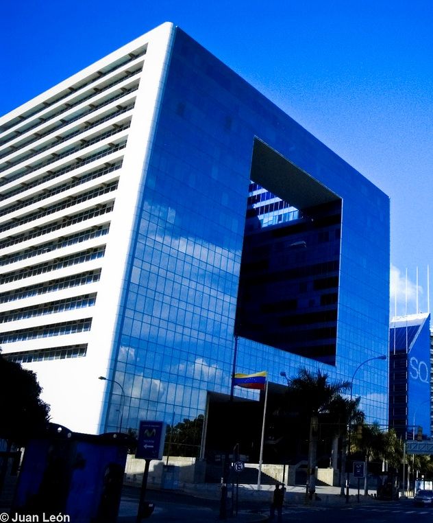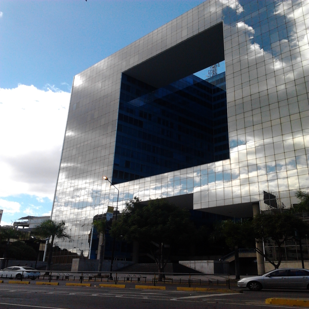 El famoso edificio Parque Cristal cuenta con espectaculares fachadas de cristal que reflejan al sur el Parque del Este, las nubes y la ciudad de Caracas.