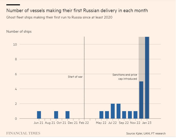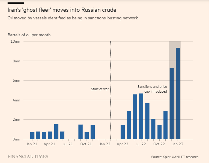 Los petroleros de la “flota fantasma” de Irán han pasado a transportar petróleo ruso desde que se intensificaron las restricciones occidentales sobre Moscú en diciembre, cuando el Kremlin recurrió a técnicas de ruptura de sanciones iniciadas por Teherán. Al menos 16 barcos que formaban parte de la red «fantasma» que permitió a Irán violar las sanciones de Estados Unidos han comenzado a enviar crudo ruso en los últimos dos meses, según una investigación del Financial Times. Antes de la oleada, solo nueve barcos habían cambiado a la ruta rusa durante los nueve meses desde el comienzo de la guerra en febrero de 2022. Los llamados barcos fantasmas son embarcaciones que disfrazan su propiedad y movimientos para facilitar el incumplimiento de las sanciones. Redes de barcos fantasmas permiten el comercio de petróleo iraní y venezolano. Agentes marítimos y analistas dijeron que Rusia estaba atrayendo a los propietarios y operadores de petroleros con tarifas premium, ya que busca proteger su principal fuente de ingresos por exportaciones de las medidas occidentales, como el tope del precio del petróleo del G7/UE. Los ingresos estimados de las exportaciones de petróleo de Rusia están marcadamente por debajo de los niveles de antes de la guerra .