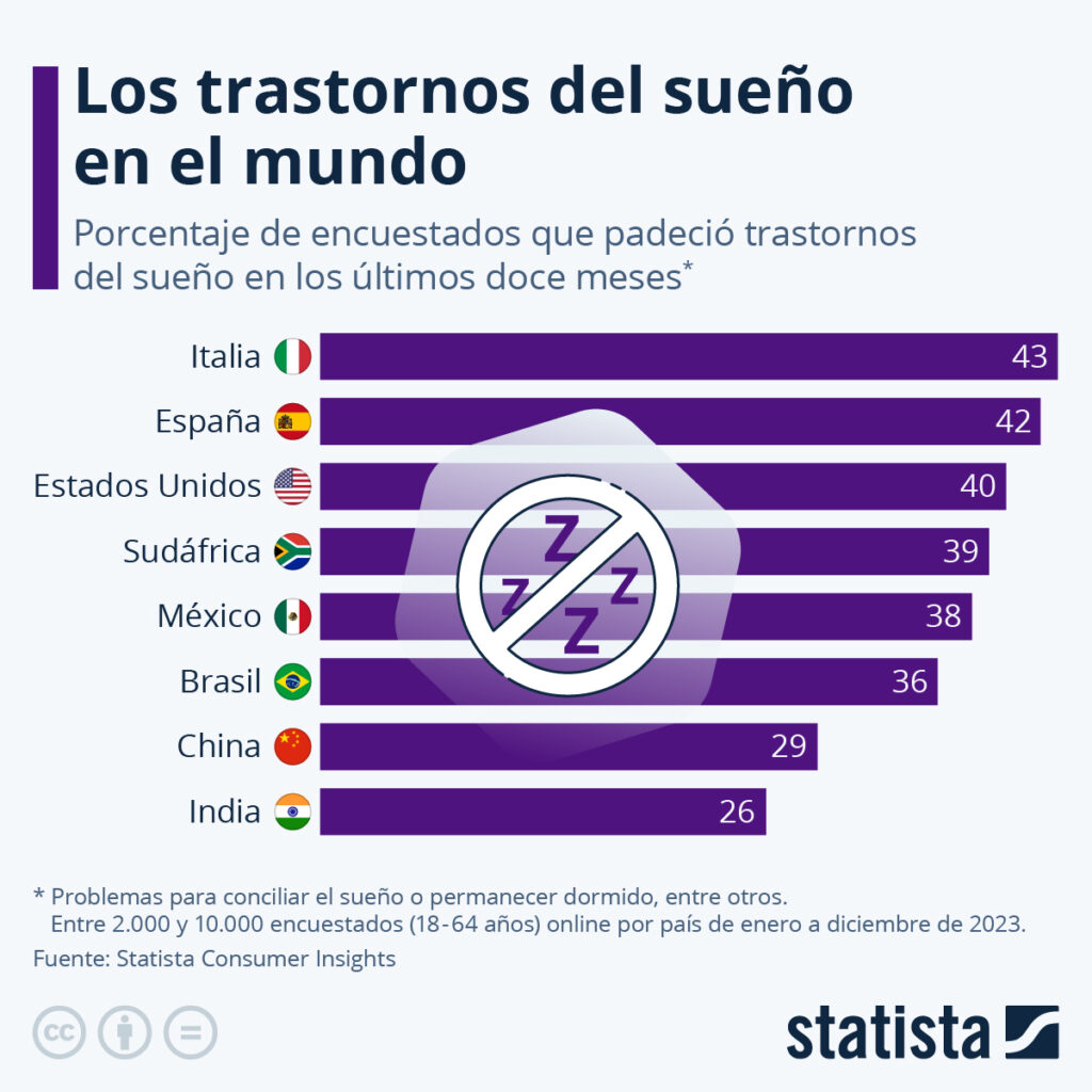 De acuerdo con datos de Statista Consumer Insights, en Italia, el 43% de los entrevistados aseguró haber padecido algún trastorno del sueño (problemas para conciliar el sueño o permanecer dormido, insomnio, etc.) en los doce meses anteriores a la encuesta.
