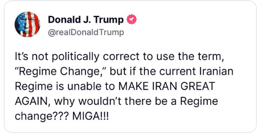 “No es políticamente correcto usar el término ‘cambio de régimen’, pero si el actual régimen iraní no puede hacer que Irán vuelva a ser grande, ¿por qué no habría un cambio de régimen? ¡MIGA!”, escribió el mandatario en su cuenta oficial de Truth Social, haciendo referencia al lema de su segunda administración: Make Iran Great Again.
