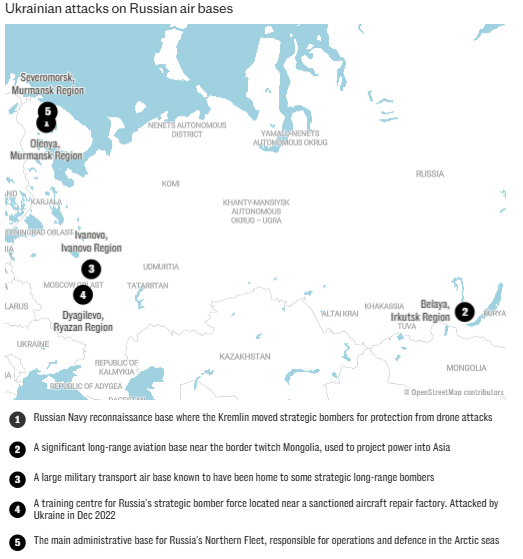 El ataque coordinado, denominado «Operación Telaraña», alcanzó las bases de Olenya (región de Múrmansk), Dyagilevo (Riazán) y Belaya (Irkutsk, Siberia), destruyendo o dañando al menos 40 aeronaves militares rusas, incluidas plataformas estratégicas irremplazables como los bombarderos Tu-95MS, Tu-22M3 y sistemas de alerta temprana A-50 AEW&C.