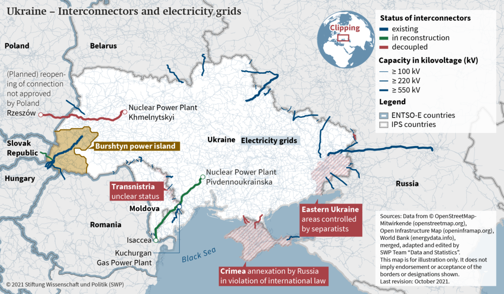 La red eléctrica de Ucrania se remonta a la época soviética, por lo que tradicionalmente está unida a la de Rusia. El país había querido deshacerse de eso durante varios años. Desde 2017 también existe un acuerdo para realizar la conexión con la red eléctrica europea.
