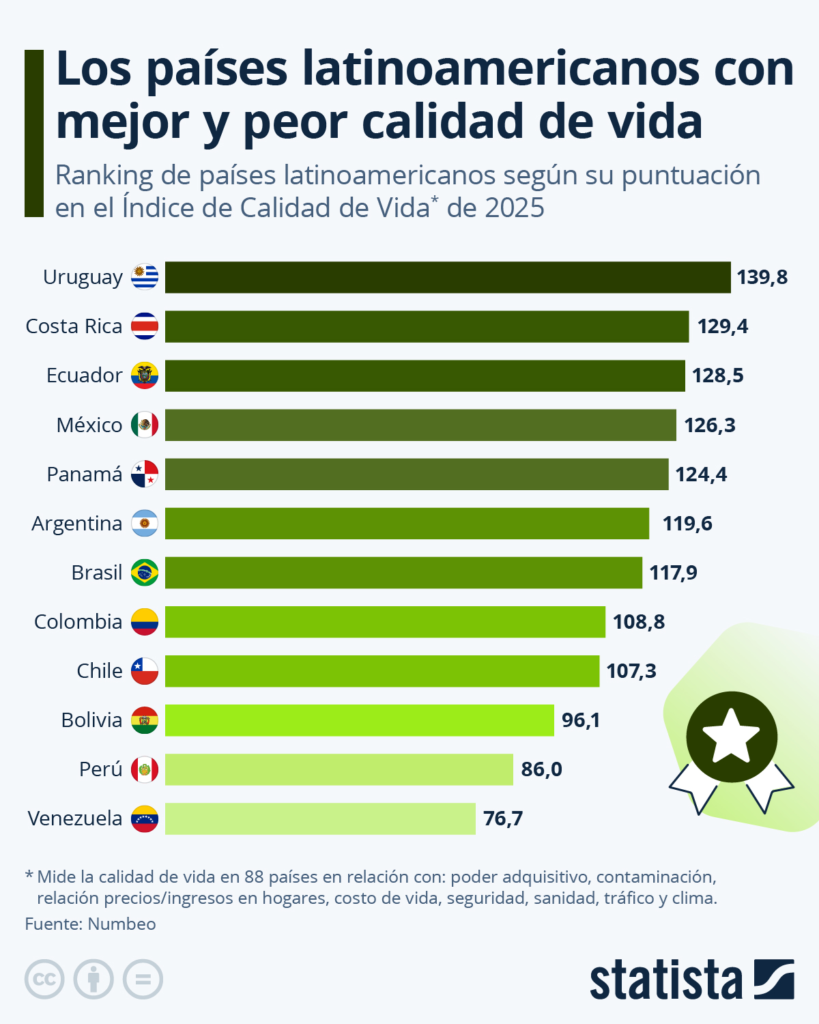 En el caso de América Latina, Uruguay encabeza el ranking regional con una puntuación de 139,8, consolidándose como el país con mejor calidad de vida en América Latina entre los doce estudiados. Le siguen Costa Rica y Ecuador.