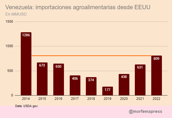 Los números también muestran que los 809 millones de dólares que destinó Caracas a la compra de productos agroalimentarios estadounidenses durante todo el año 2022 es la mayor cifra en ocho años, pues desde 2014, cuando la negociación se ubicó en 1.286 millones dólares, el monto no alcanzaba los 700 millones.