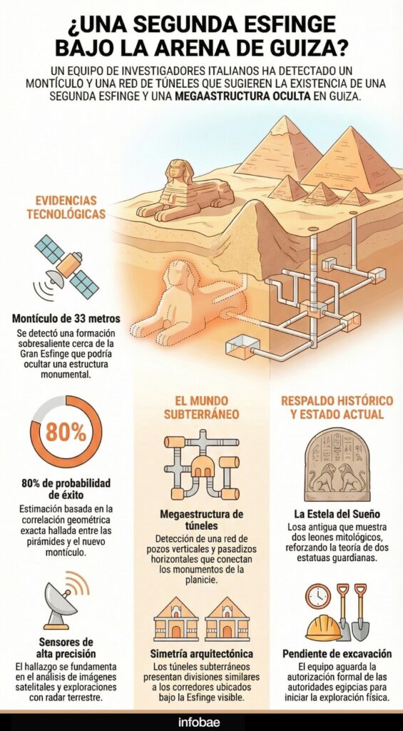 Un equipo de investigadores italianos, liderado por el ingeniero radarista Filippo Biondi, afirma haber detectado señales que sugieren la posible existencia de una segunda Esfinge enterrada bajo la arena en el complejo de las pirámides de Guiza y plantea la hipótesis de una megastructura subterránea de enormes dimensiones, según informó el New York Post. Este hallazgo reactiva el interés mundial en los secretos aún no revelados del principal conjunto arqueológico de Egipto.