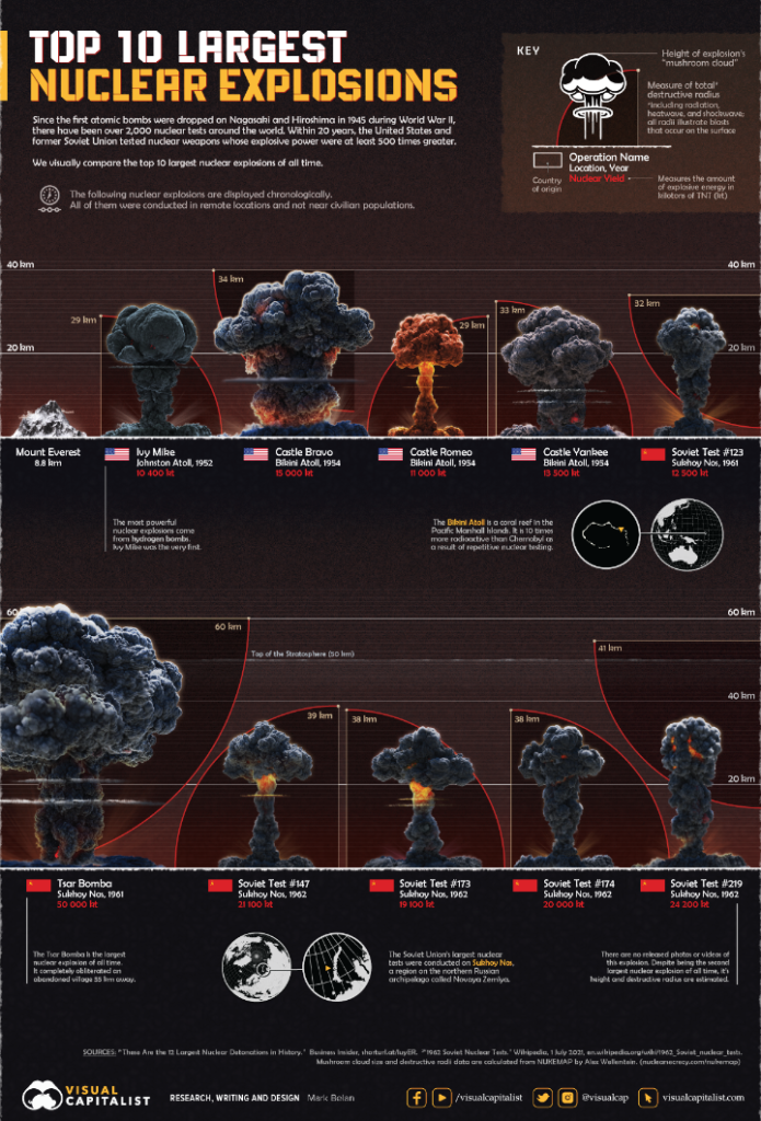 A medida que la Guerra Fría se intensificó en los años posteriores a la Segunda Guerra Mundial, los EE. UU. y la Unión Soviética probaron bombas que tenían al menos 500 veces más poder explosivo. Esta infografía compara visualmente las 10 explosiones nucleares más grandes de la historia.