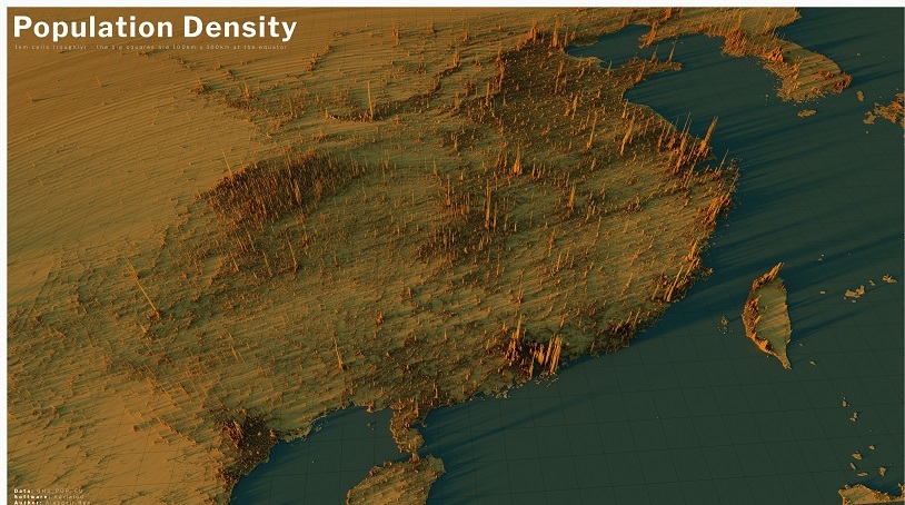 Aunque parecen topográficos e incluso se asemejan a áreas urbanas, los mapas visualizan la densidad de población en cuadrados. La altura de cada barra representa la cantidad de personas que viven en ese cuadrado específico, con el mapa global que muestra cuadrados de 2 km x 2 km y los mapas posteriores que muestran cuadrados de 1 km x 1 km.