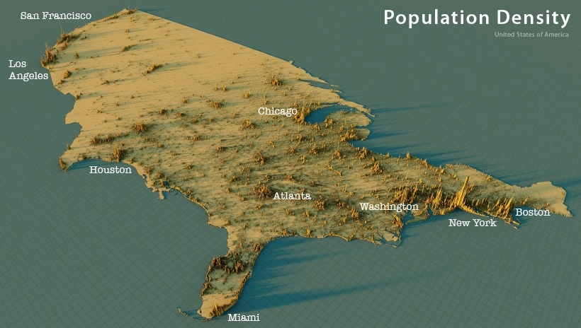 Claramente visibles son los grupos en Florida (y no centrados exclusivamente en Miami como algunos podrían creer), Illinois, Georgia y Texas. Como se esperaba, la población es escasa en el oeste, pero las áreas metropolitanas de Los Ángeles y el Área de la Bahía de California compensan la discrepancia y están justo detrás de los picos de densidad de la ciudad de Nueva York en altura.