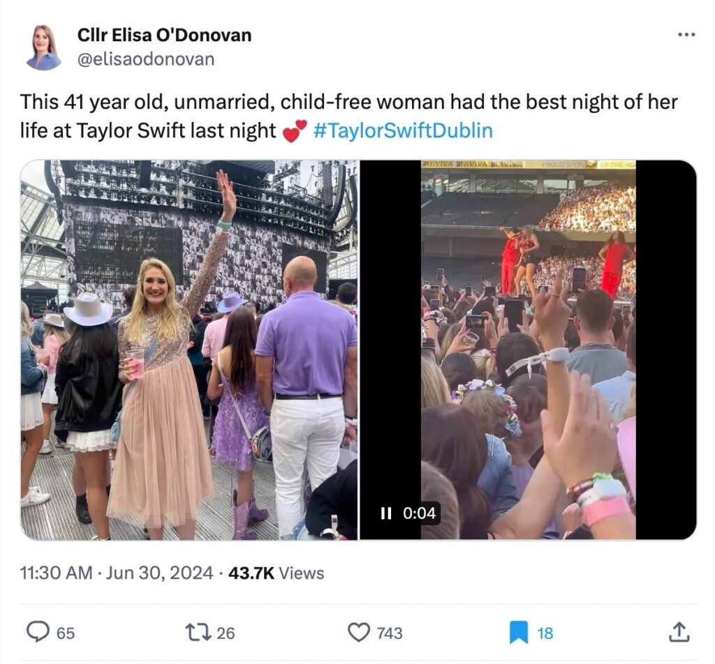 Lo que puede parecer un poco desconcertante es por qué la gente habla con alegría y orgullo de llevar una vida “sin hijos”, casi como si tuviera algún mérito. Tomemos como ejemplo el siguiente tuit de un político local de Irlanda: “Esta mujer de 41 años, soltera y sin hijos tuvo la mejor noche de su vida anoche en Taylor Swift”.