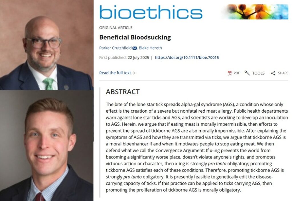 El resumen inicial del artículo no tiene desperdicio: «La picadura de la garrapata estrella solitaria propaga el síndrome alfa-gal (AGS), una afección cuyo único efecto es la creación de una alergia a la carne roja. Los departamentos de salud pública advierten contra las garrapatas estrella solitaria y el AGS, y los científicos están trabajando para desarrollar una inoculación para el AGS. En este artículo, argumentamos que si comer carne es moralmente inaceptable, entonces los esfuerzos para prevenir la propagación del AGS transmitido por garrapatas también son moralmente inaceptables. Después de explicar los síntomas del AGS y cómo se transmiten a través de las garrapatas, argumentamos que el AGS transmitido por garrapatas es un biopotenciador moral siempre y cuando motiva a las personas a dejar de comer carne. Actualmente, es posible editar genéticamente la capacidad de las garrapatas de portar enfermedades . Si esta práctica se puede aplicar a las garrapatas portadoras de AGS, entonces promover la proliferación del AGS transmitido por garrapatas es moralmente obligatorio».