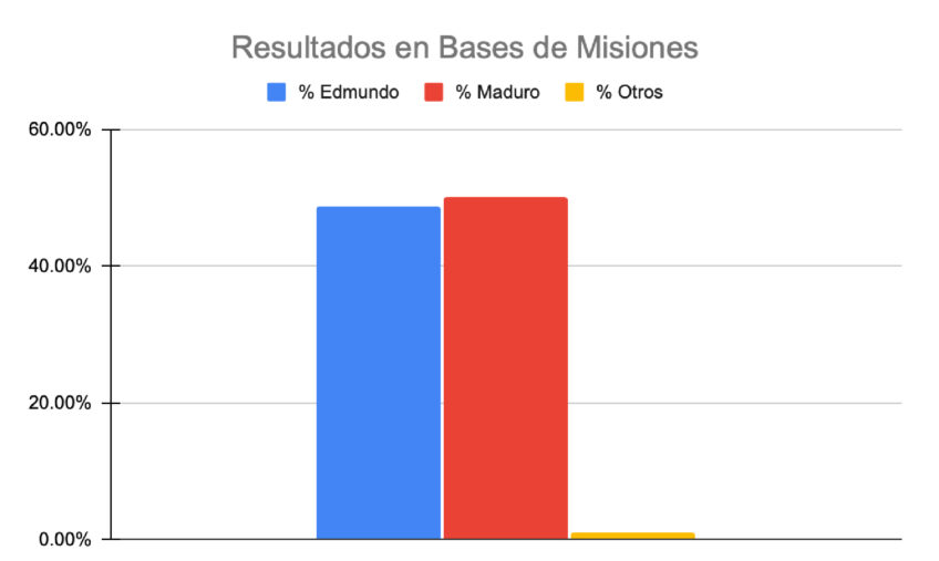 En 116 mesas de Bases de Misiones analizadas, Nicolás Maduro tuvo 50,20% de los votos contra 48,79% de Edmundo González Urrutia. Estos centros tuvieron un porcentaje inusualmente alto de participación, con un 79,81% en promedio, casi 20 puntos más alto que la participación nacional.