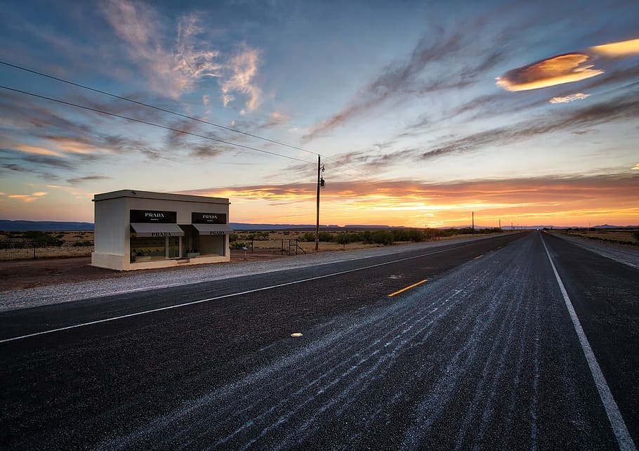 Desde hace varios años vemos muy a menudo una imagen con fondo blanco en el que se pueden leer las palabras «Prada Marfa» con la tipografía de la marca y debajo una flecha y el número 1837 MI (millas).