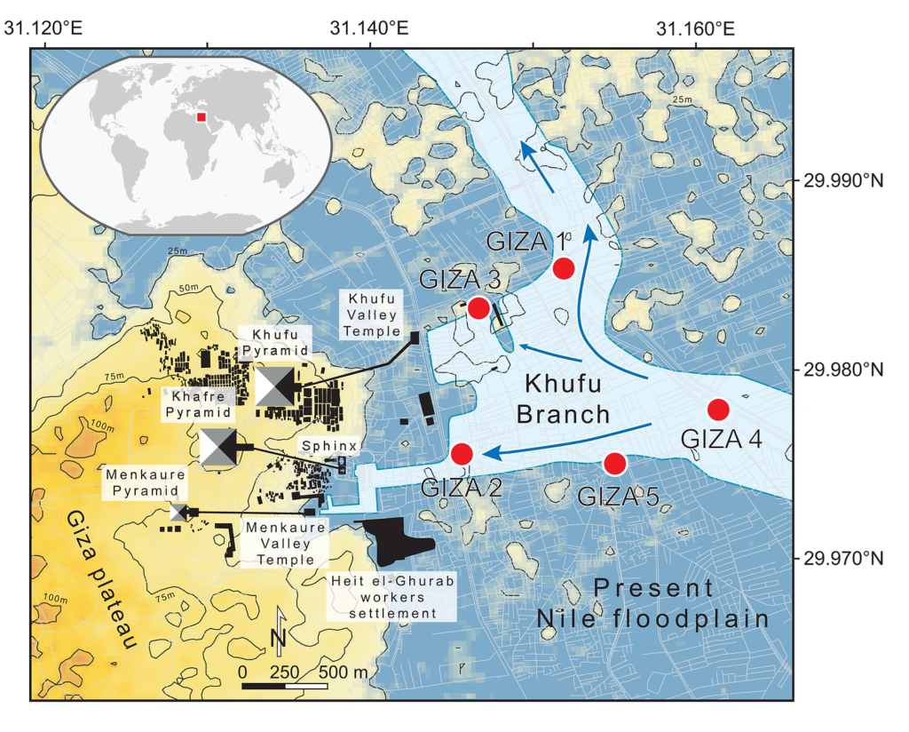 Un estudio publicado en la revista Proceedings of the National Academy of Sciences afirma que el antiguo paisaje acuático y los niveles más altos de los ríos hace unos 4.500 años facilitaron la construcción del Complejo de Pirámides de Giza.