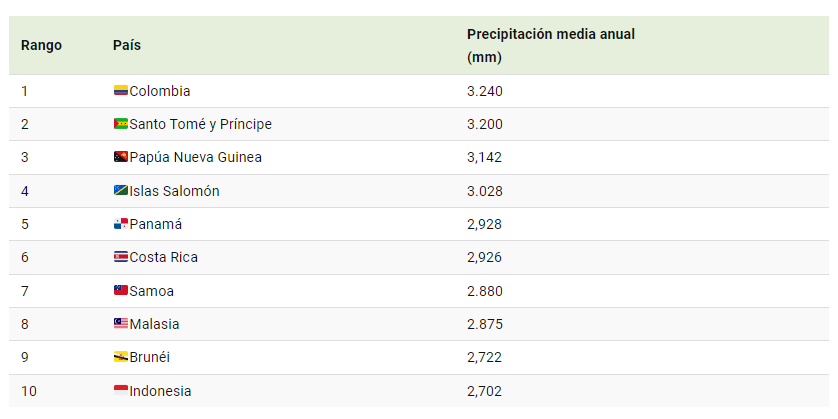 Colombia encabeza la lista de naciones con la precipitación promedio más alta con 3.240 milímetros (128 pulgadas) en un año.