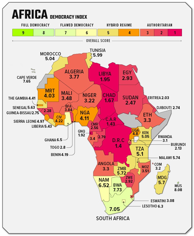 África Subsahariana tiene la mayoría de los países en la parte inferior de las clasificaciones del Índice de Democracia.